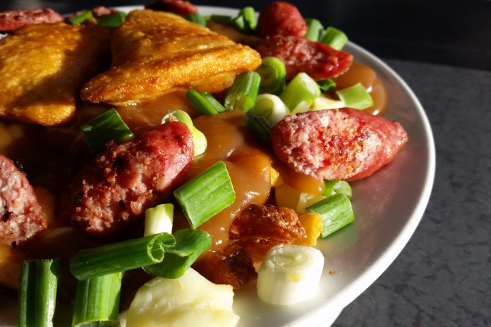 Frites maison garnies de pérogies, d’un choix de bacon ou de saucisses paysannes, ainsi que d’oignons verts, de crème sûre et d’une délicieuse sauce brune.